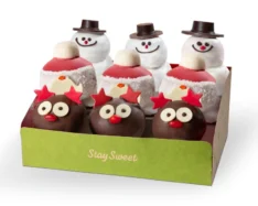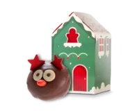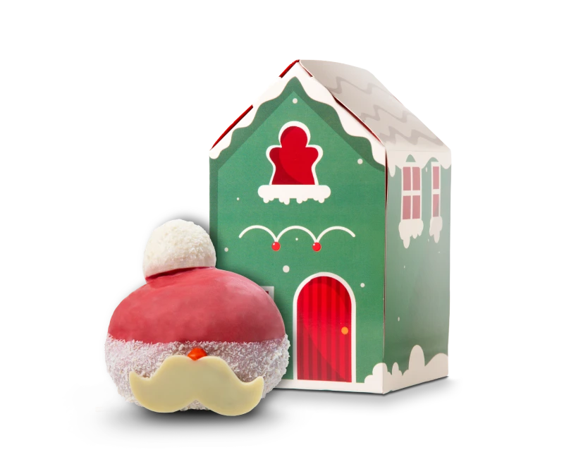 Nuestro Santa está hecho de masa de berlina elaborada con nuestra masa clásica y esponjosa. Va rellena de nutty —una crema de frutos secos suave y deliciosa— y coronada con un encantador pompón de nube. La bañamos en chocolate blanco, y la cubrimos con coco rallado para darle un acabado nevado que enamora a primera vista… y a primer bocado.